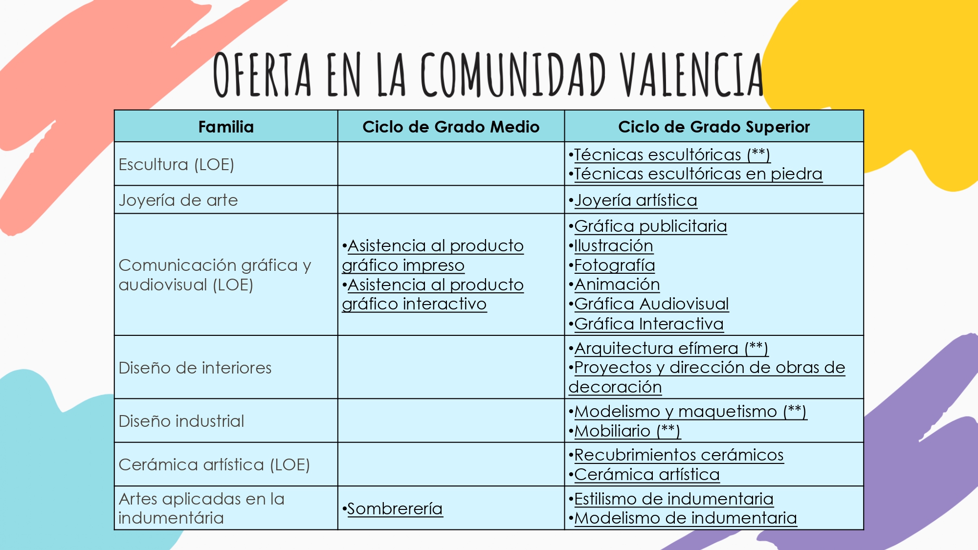 Artes plásticas y diseño A través del siguiente link puedes acceder al power sobre artes plásticas y diseño: https://elorienta.com/blogorientacioieslesalfabegues/data/uploads/powers-orientacion/ensenanzas-de-artes-plasticas-y-diseno.pdf