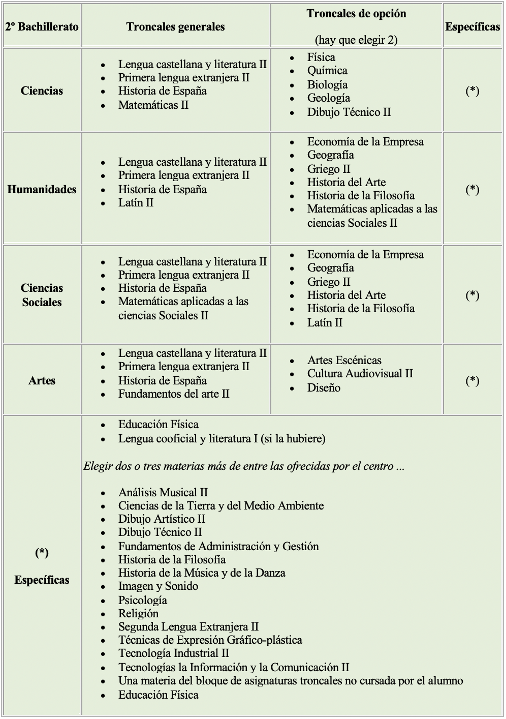 El Bachillerato está organizado en materias troncales y materias específicas y la distribución de materias a lo largo de los 2 cursos es la siguiente: