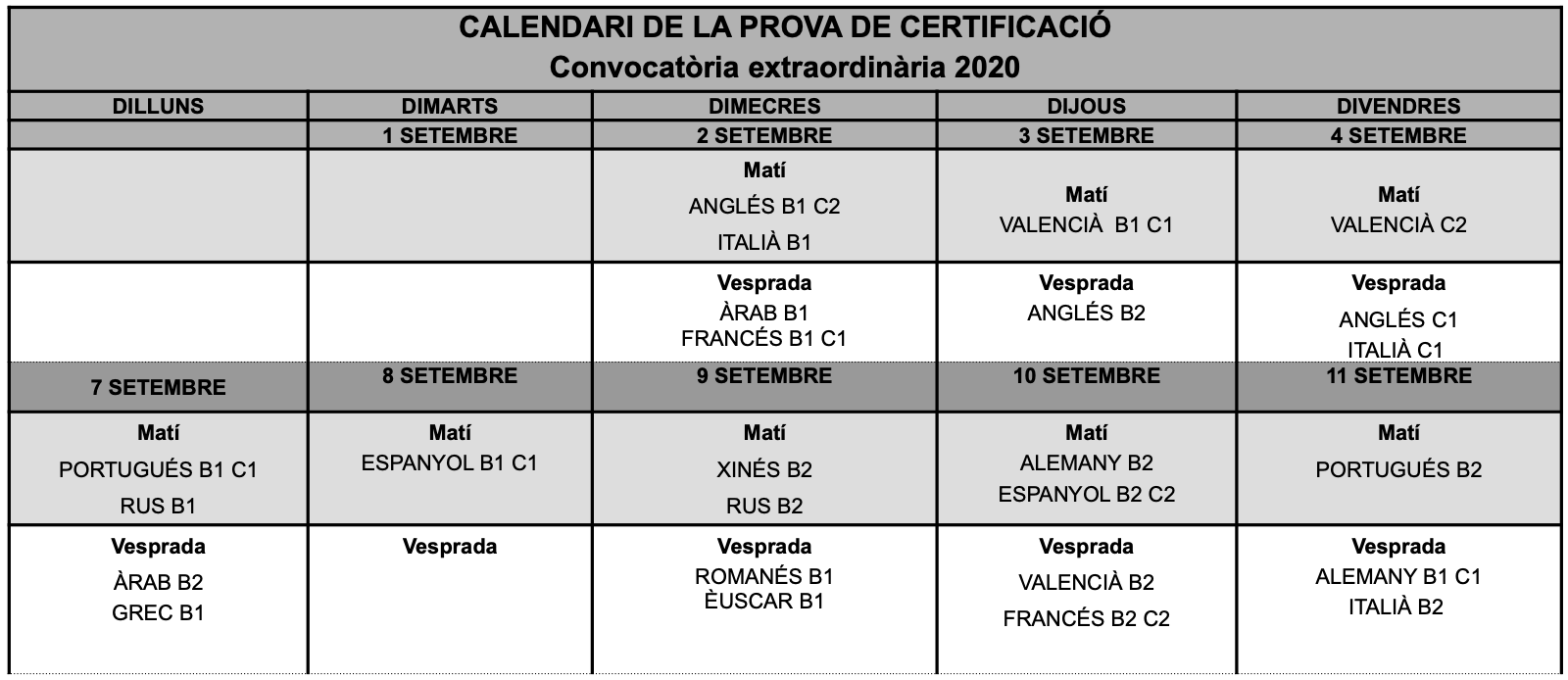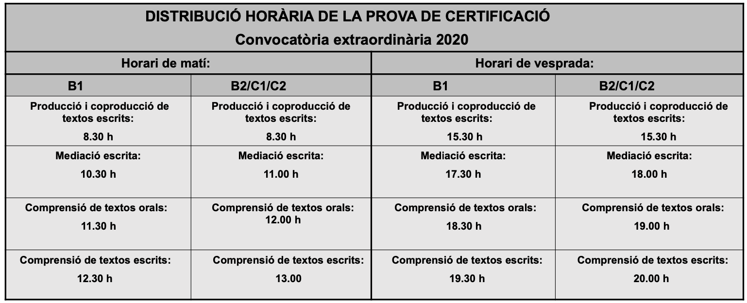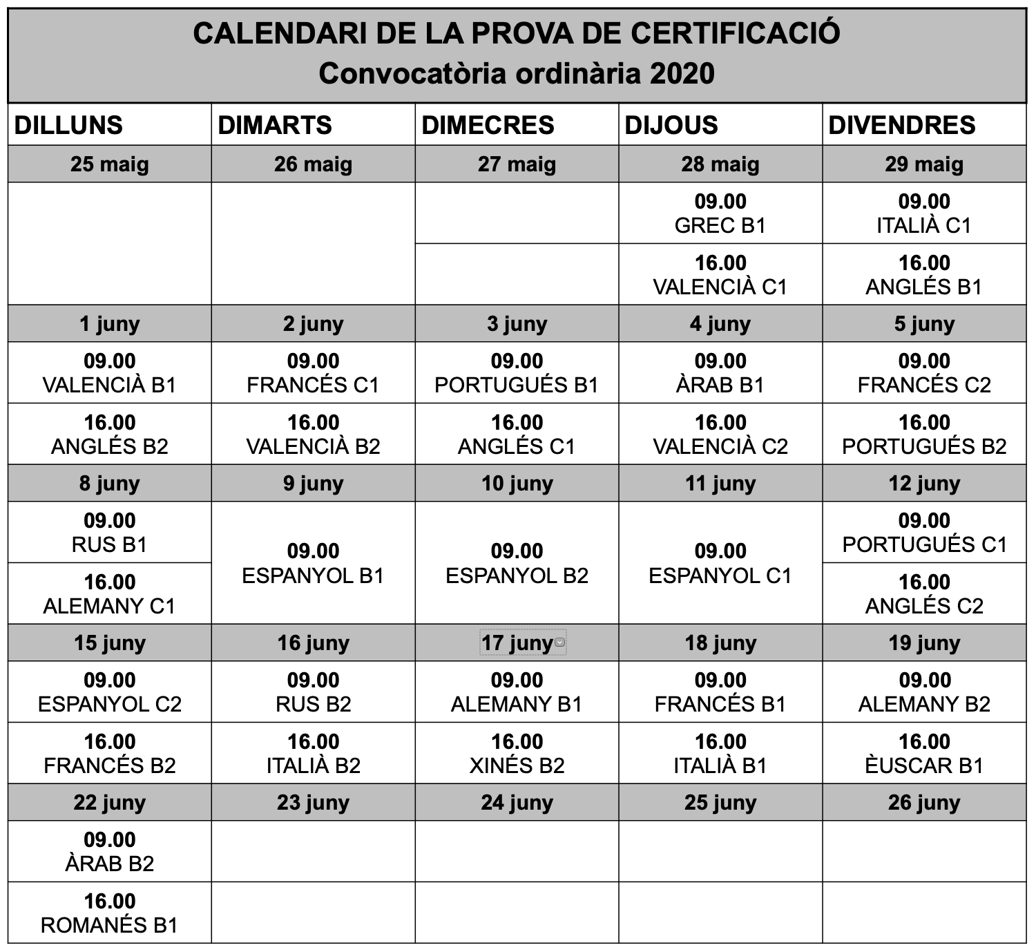 - La prueba de certificación de la convocatoria ordinaria de 2020 empezará a partir del día 28 de mayo en las fechas que determine la correspondiente resolución de convocatoria de inscripción a las pruebas para cada idioma y nivel.