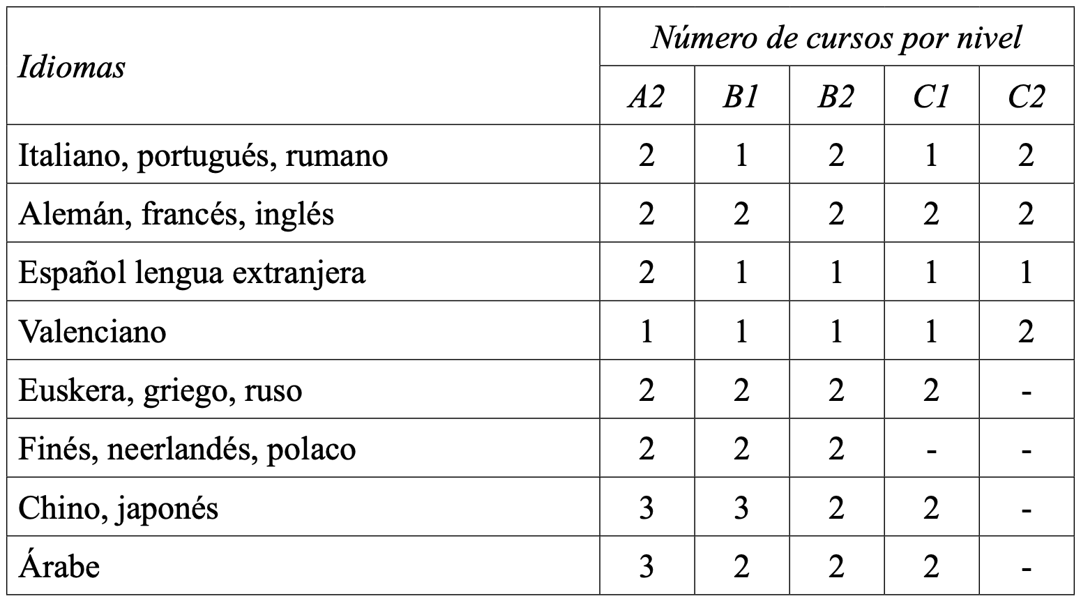 Las enseñanzas de cada nivel se organizarán en uno o varios cursos anuales. Cada curso tendrá una duración mínima de 120 horas. El número de cursos que comprenderá cada uno de los niveles básico, intermedio y avanzado de los diferentes idiomas es el que se recoge a continuación: