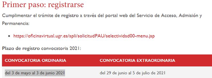 - Registro: desde el 18 de mayo de 2020 hasta el último día de matriculación para las pruebas (28 de junio)