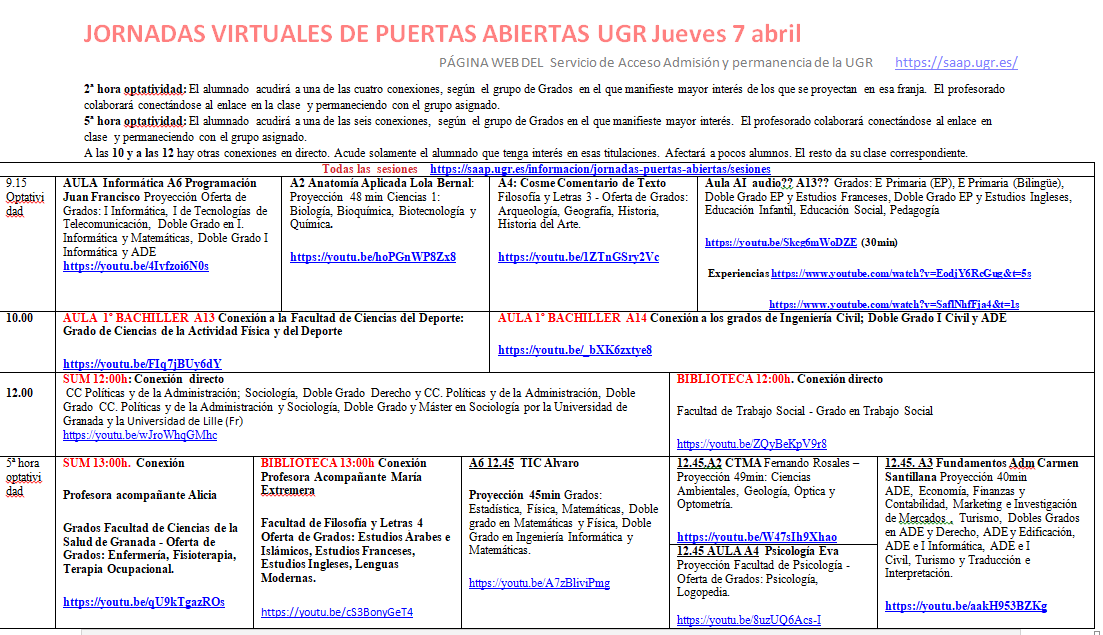 Novedades (5/6/2020) Jornadas Virtuales de Puertas Abiertas de la Universidad de Granada, Charlas específicas de las Facultades y Escuelas de la Universidad de Granada . Días 10, 11 y 12 de junio de 2020 y podrán seguirse a través de YouTube. https://saap.ugr.es/