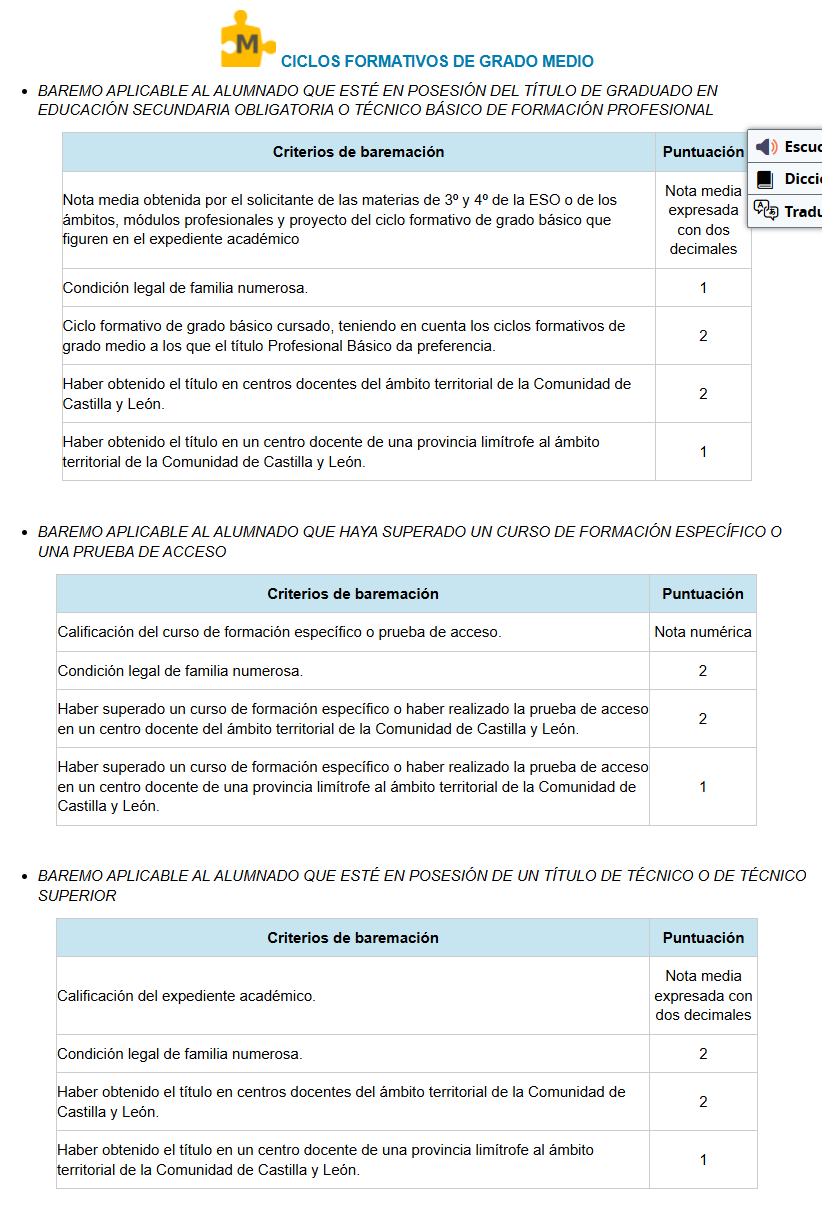 Baremo aplicable para la admisión en GFGM en Castilla y León