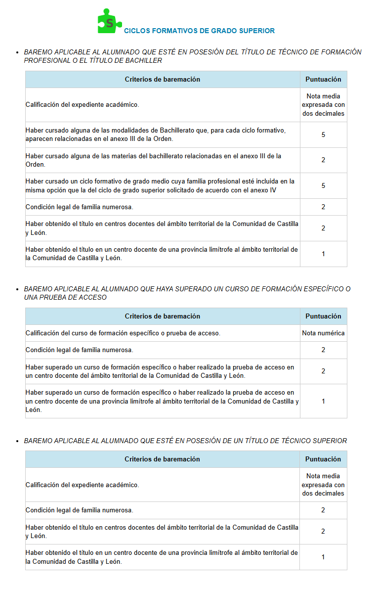 Baremo aplicable para la admisión a GFGS en Castilla y León