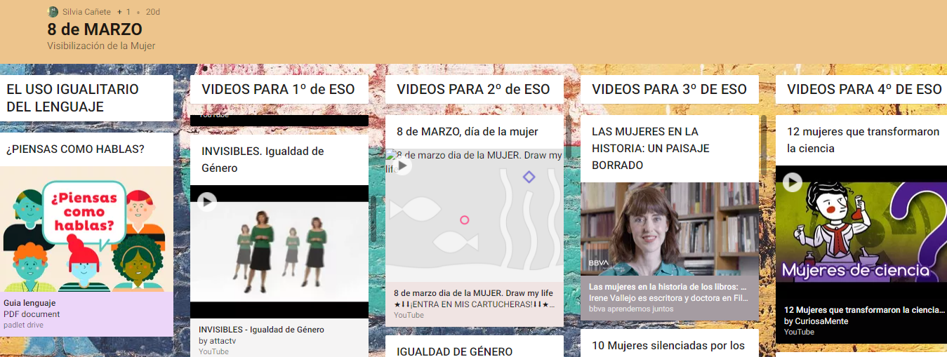 8 MARZO. DÍA DE LA MUJER. Material de apoyo para llevar a cabo las tutorías del 8 de Marzo. Padlet creado por Silvia Cañete.