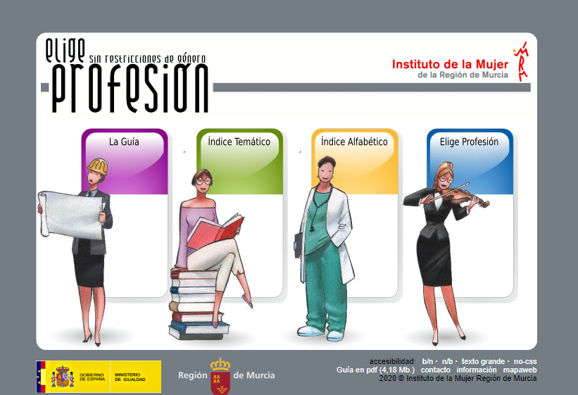 El instituto de la mujer de Murcia, ha publicado esta GUÍA DE PROFESIONES SIN RESTRICCIONES DE GÉNERO. En ella descubrirás multitud de profesiones, cuáles son las aptitudes que deberás poseer para desempeñarlos, sus salidas profesionales, los estudios requeridos, etc.