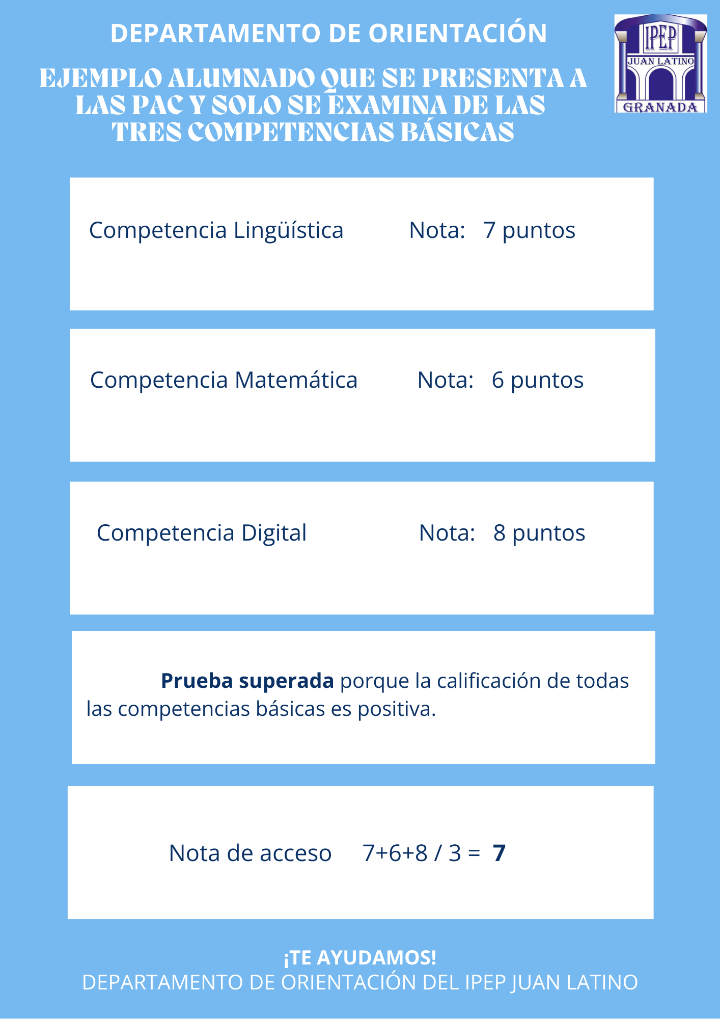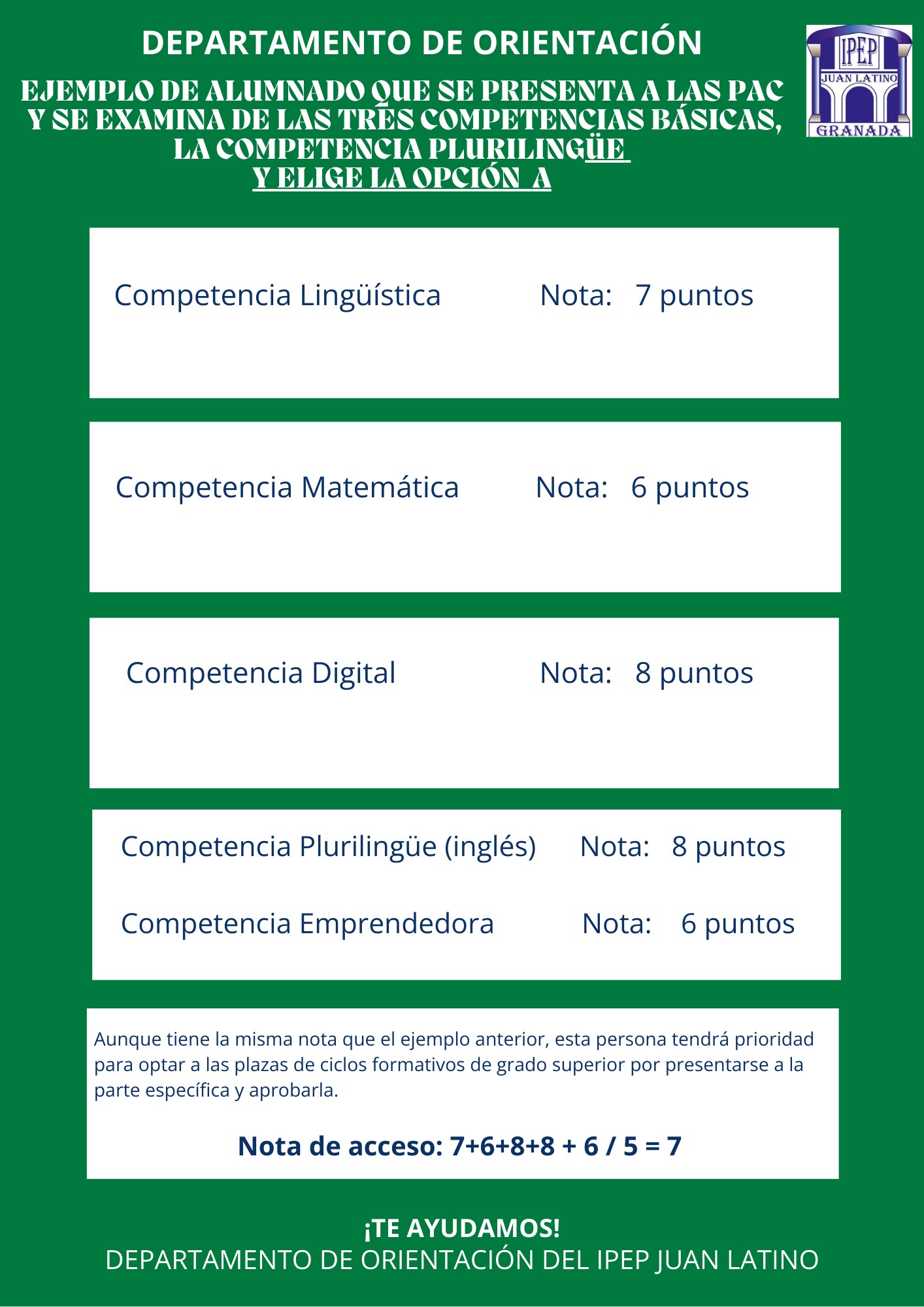 7. En el ámbito de la Comunidad Autónoma de Andalucía, con objeto de determinar la prioridad en el acceso a ciclos formativos de grado superior, si la calificación de las competencias básicas, la competencia clave plurilingüe (Inglés) y la competencia clave de la opción es positiva, se calculará la media aritmética de las calificaciones de las cinco competencias resultando una nota numérica entre 5 y 10 con dos decimales.