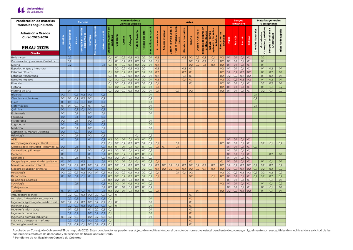 PONDERACIONES DE LAS MATERIAS DE BACHILLERATO LOMLOE (PAU) CURSO 2025-2026 Y SUCESIVOS DE LA ULL: