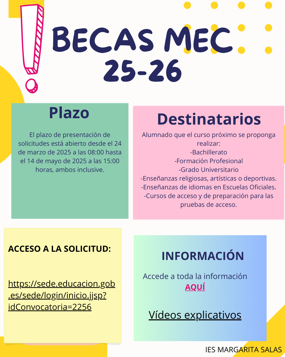 Información: https://www.becaseducacion.gob.es/becas-y-ayudas.html