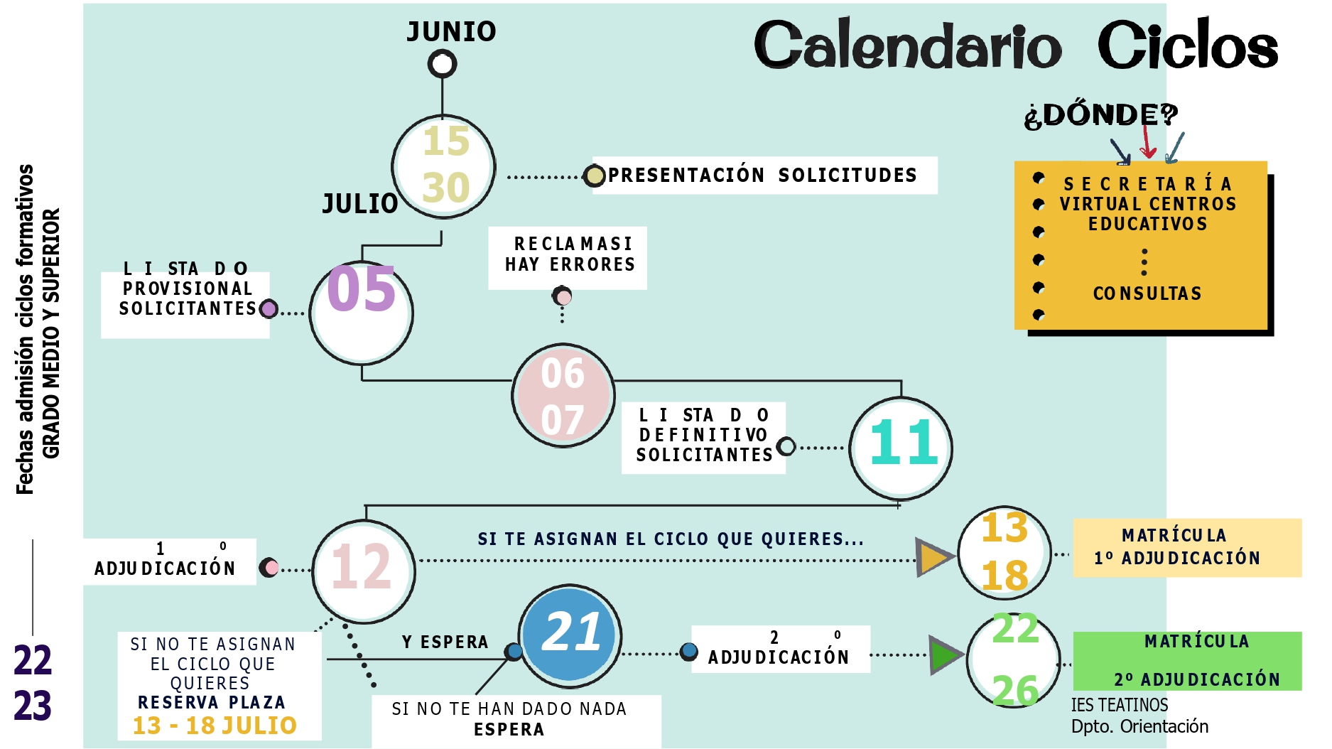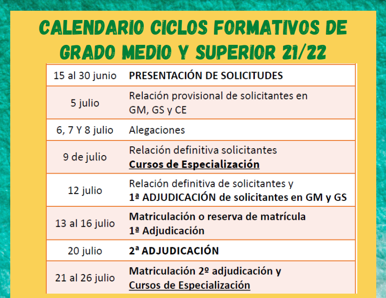 MUY IMPORTANTE: ESCOLARIZACIÓN DE F.P. Ya puedes consultar toda la información para realizar la solicitud para los Ciclos Formativos de Grado Medio. Plazo de solicitudes: del 15 al 30 de Junio. Habilitado el enlace al trámite.