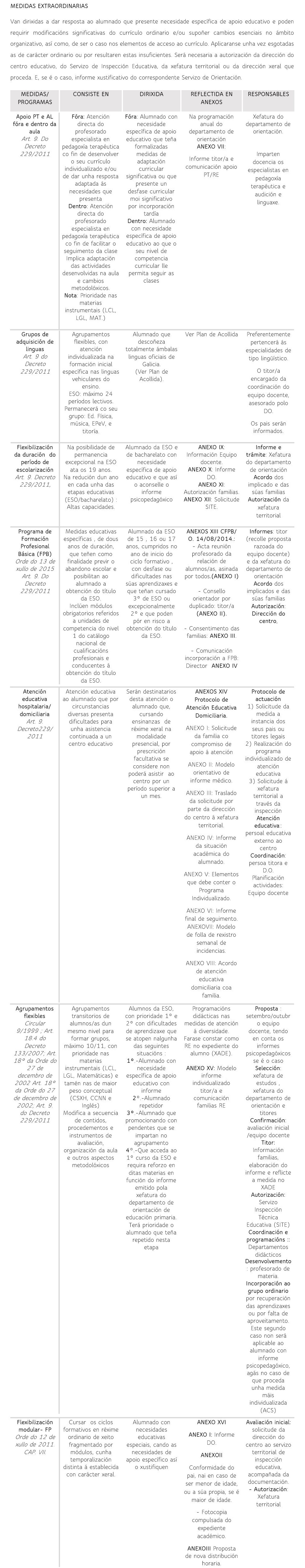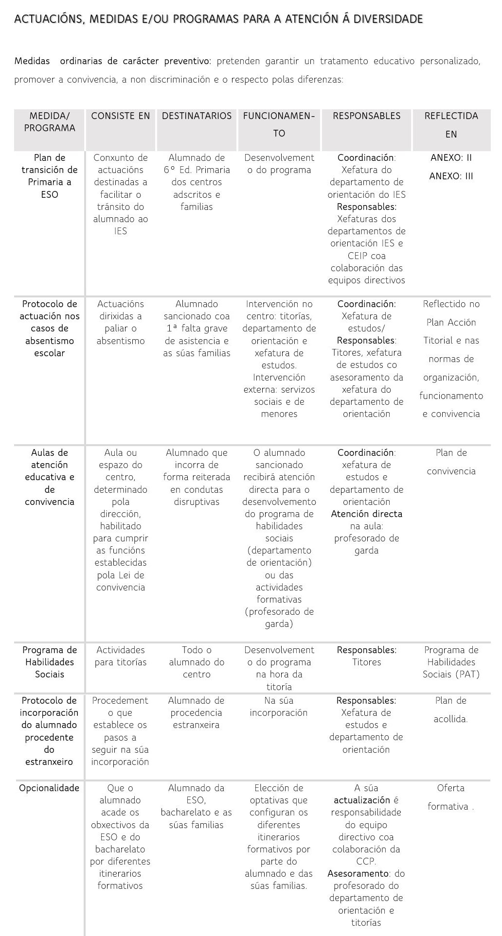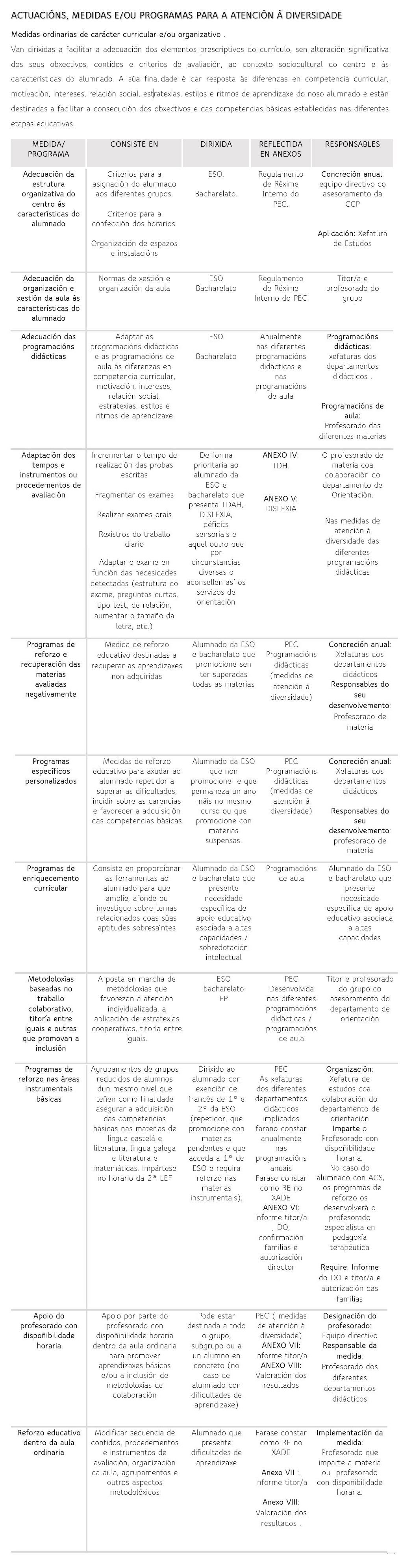 Dentro deste documento tamén se concretan unha serie de medidas de atención á diversidade. Son todas aquelas actuacións, estratexias e/ou programas destinadas a dar resposta axustada ás necesidades do alumnado. Se clasifican en dous tipos: ordinarias e extraordinarias.