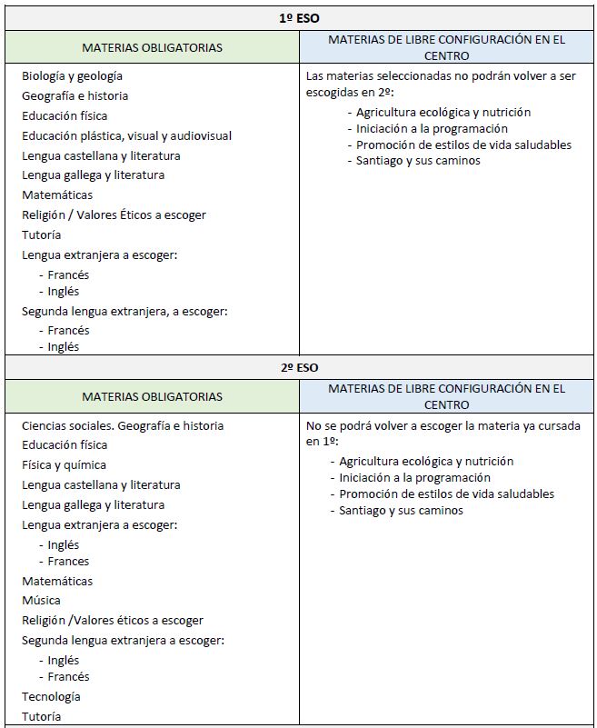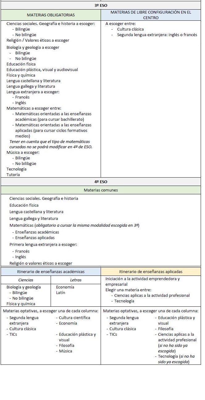 Existen distitnos tipo de materias: troncais, específicas e de libre configuración autonómica. No noso centro a oferta é a seguinte (podes descargar esta información facendo click na imaxe):