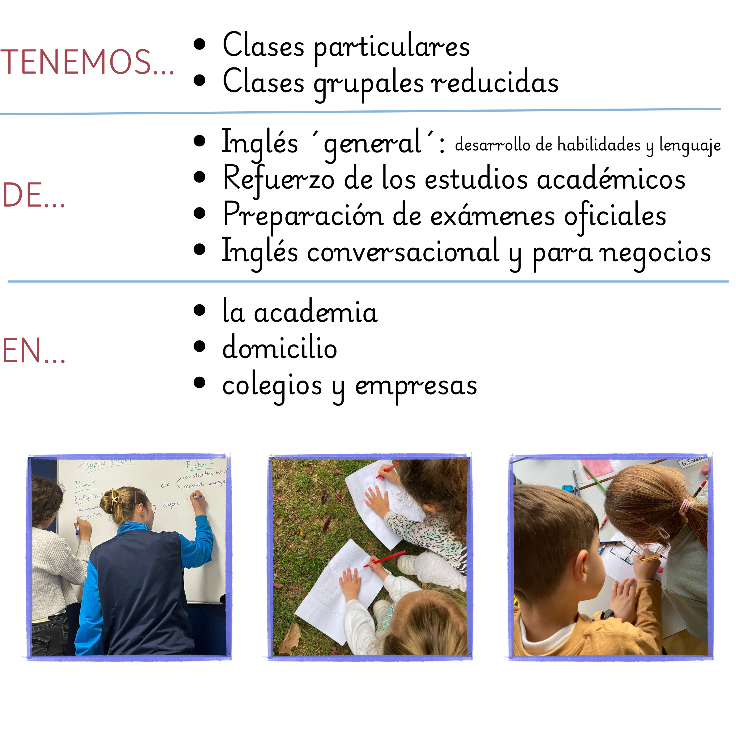 Nos enorgullecemos de nuestra adaptabilidad, asegurando que cada estudiante —ya sea niño, adolescente o adulto— disfrute de una experiencia especializada y diseñada a su medida. Desde la dinámica de nuestros grupos pequeños hasta la atención exclusiva de nuestras clases particulares, hay algo para cada necesidad.