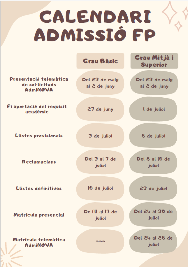 CALENDARI D'ADMISSIÓ EN FORMACIÓ PROFESSIONAL 2025-26