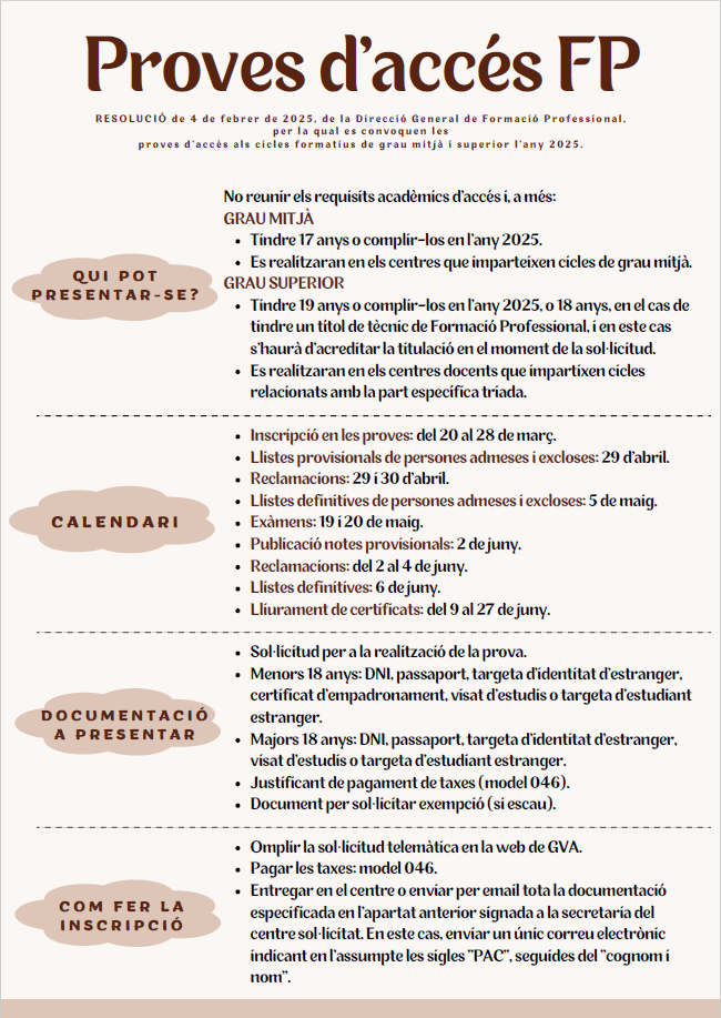 Clica ACÍ per a accedir a la web de GVA on trobar tota la informació sobre les proves d'accés a cicle formatiu de grau mitjà i superior.