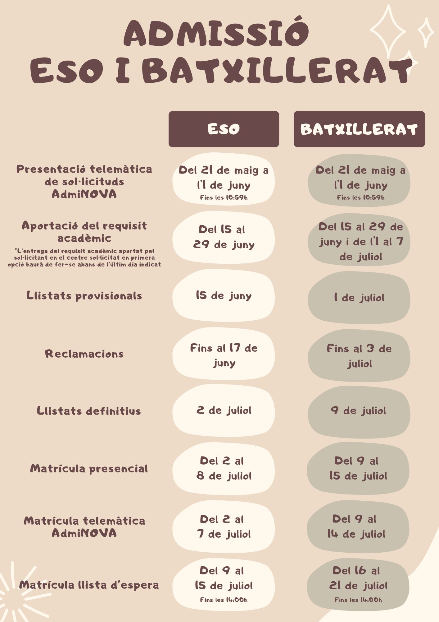 La presentació de sol·licituds per a l'admissió a Batxillerat serà del 15 al 23 de maig. Calendaris d'admissió (clica en cadascun d'ells):