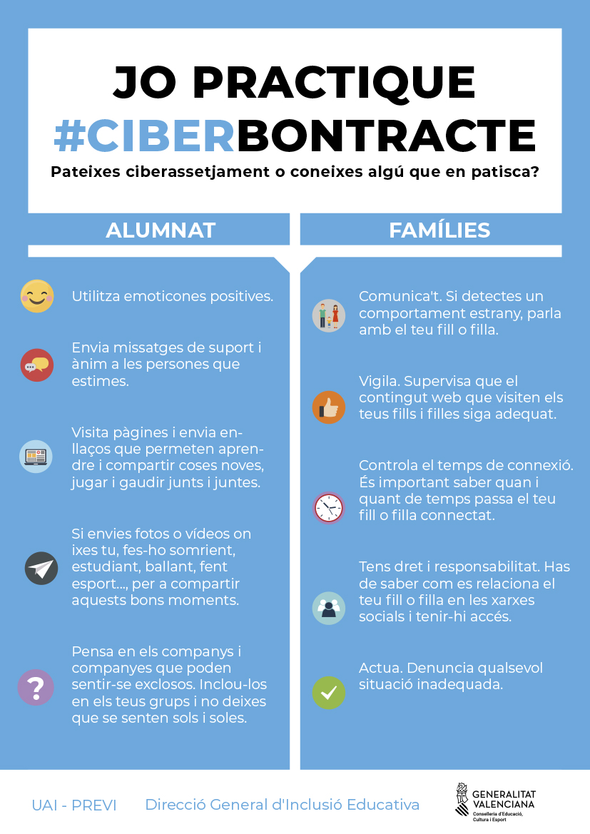 A través d'infografies i píndoles informatives, volem recordar a les famílies i l'alumnat quines són les recomanacions per a utilitzar internet i les xarxes socials de manera segura i adequada. Així mateix, volem informar-los sobre les vies de comunicació o denúncia sobre possibles casos de ciberassetjament, sexting o grooming, entre altres.