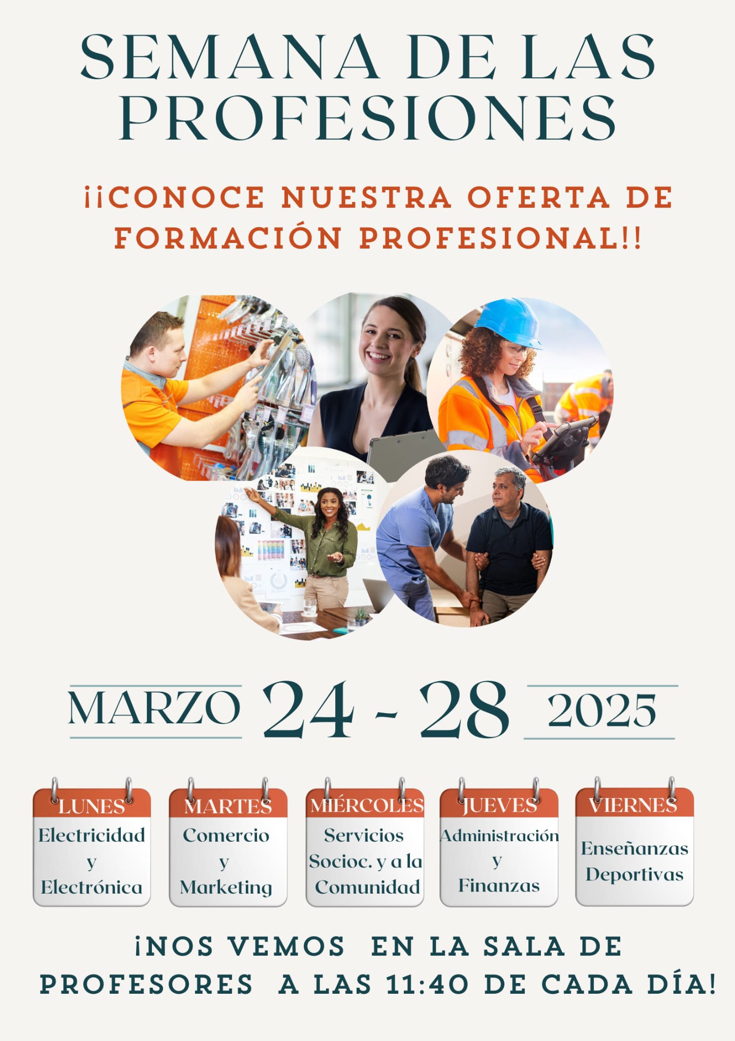 La próxima semana, del 24 al 28 de marzo, el IES La Laboral de La Laguna organiza la "Semana de las Profesiones". Esta actividad tiene el objetivo de que el alumnado del centro que esté interesado conozca nuestra oferta de Ciclos Formativos de Grado Medio y Superior.